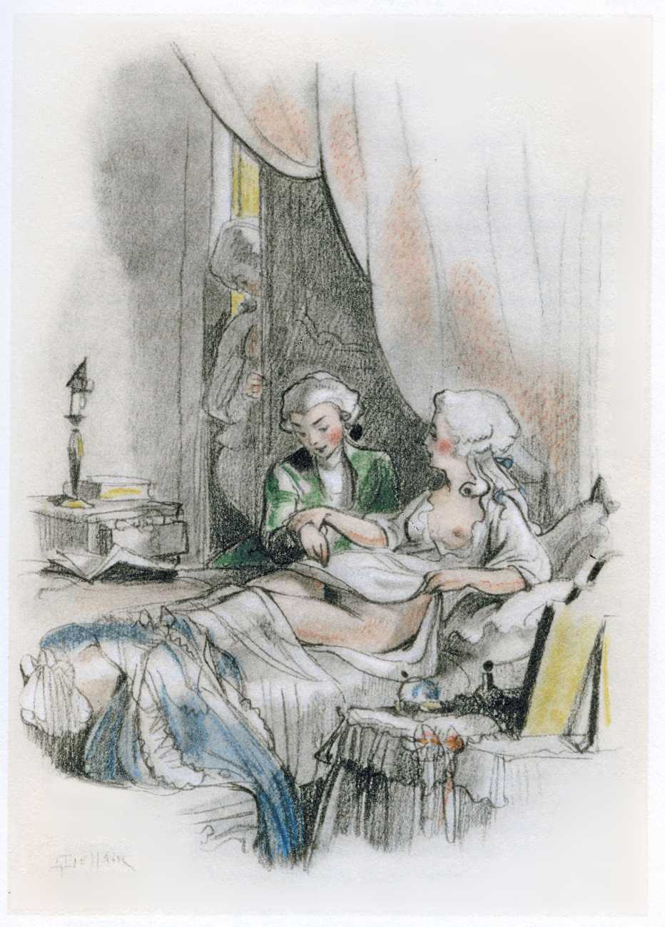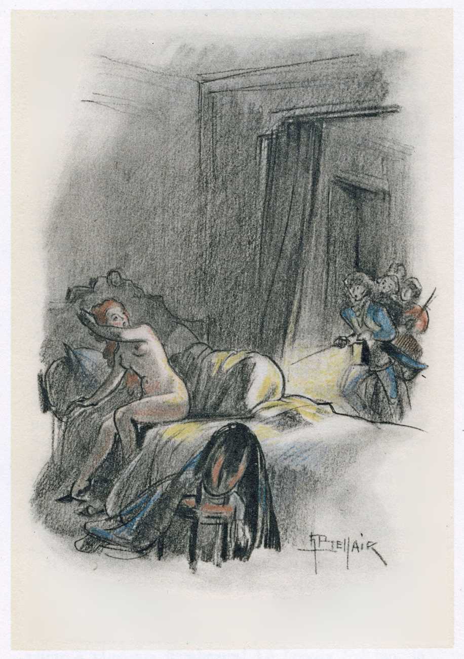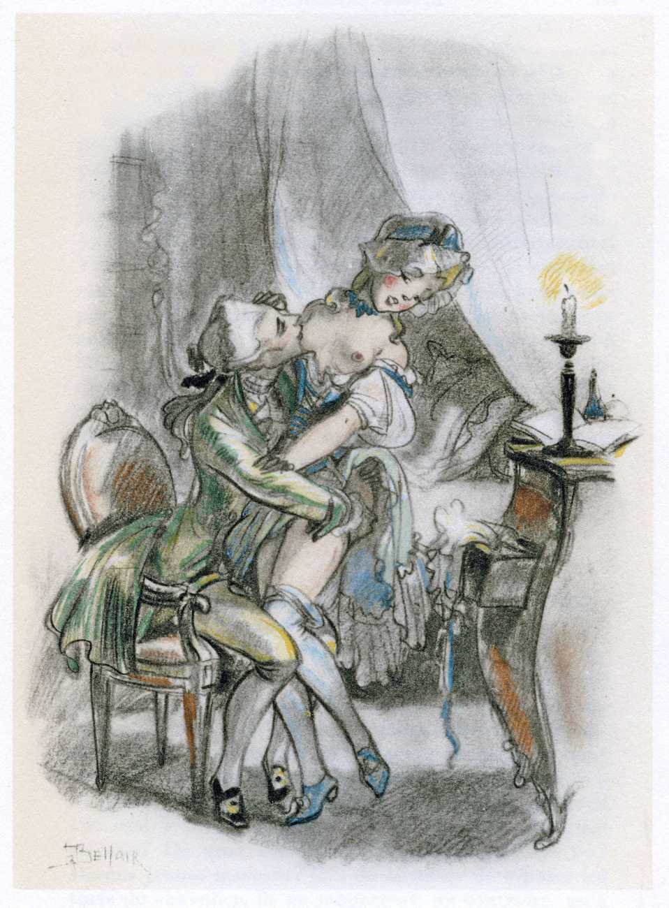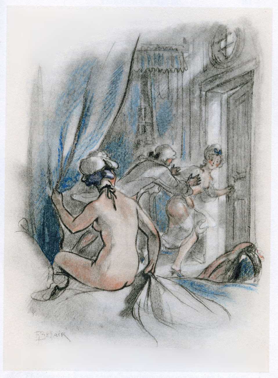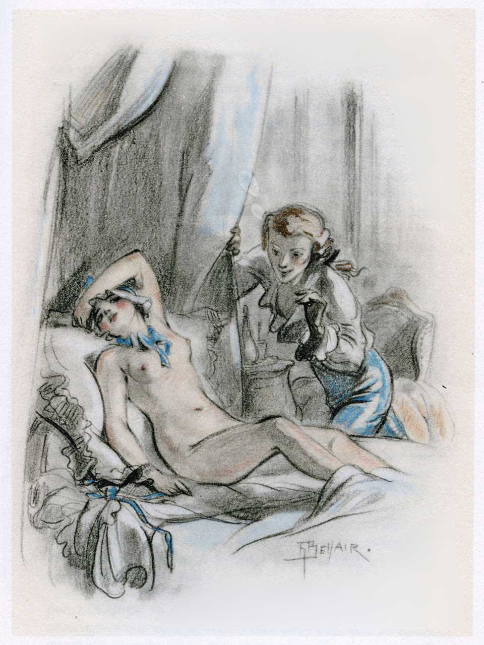 Bellair also illustrated some ten books, the earliest commission being in 1926 for fourteen plates to accompany an edition of the seventeenth-century satirical poetry collection Voyage de Chapelle et de Bachaumont, written by by the two eponymous poets during a trip through Provence and Languedoc. The first of several erotic classics for which she produced drawings was Hugues Rebell’s Les nuits chaudes du Cap Français, and it would appear that her skill and reliability in the genre attracted the attention of other Paris publishers, resulting in commissions for Andréa de Nerciat’s Félicia, Pierre Louÿs’ Roi Pausole, and Théophile Gautier’s Fortunio.