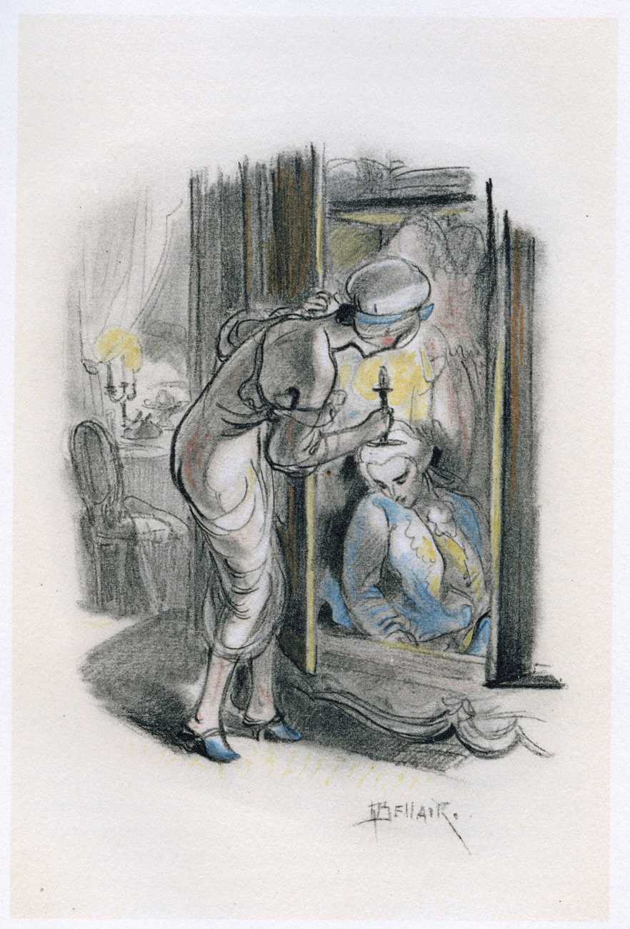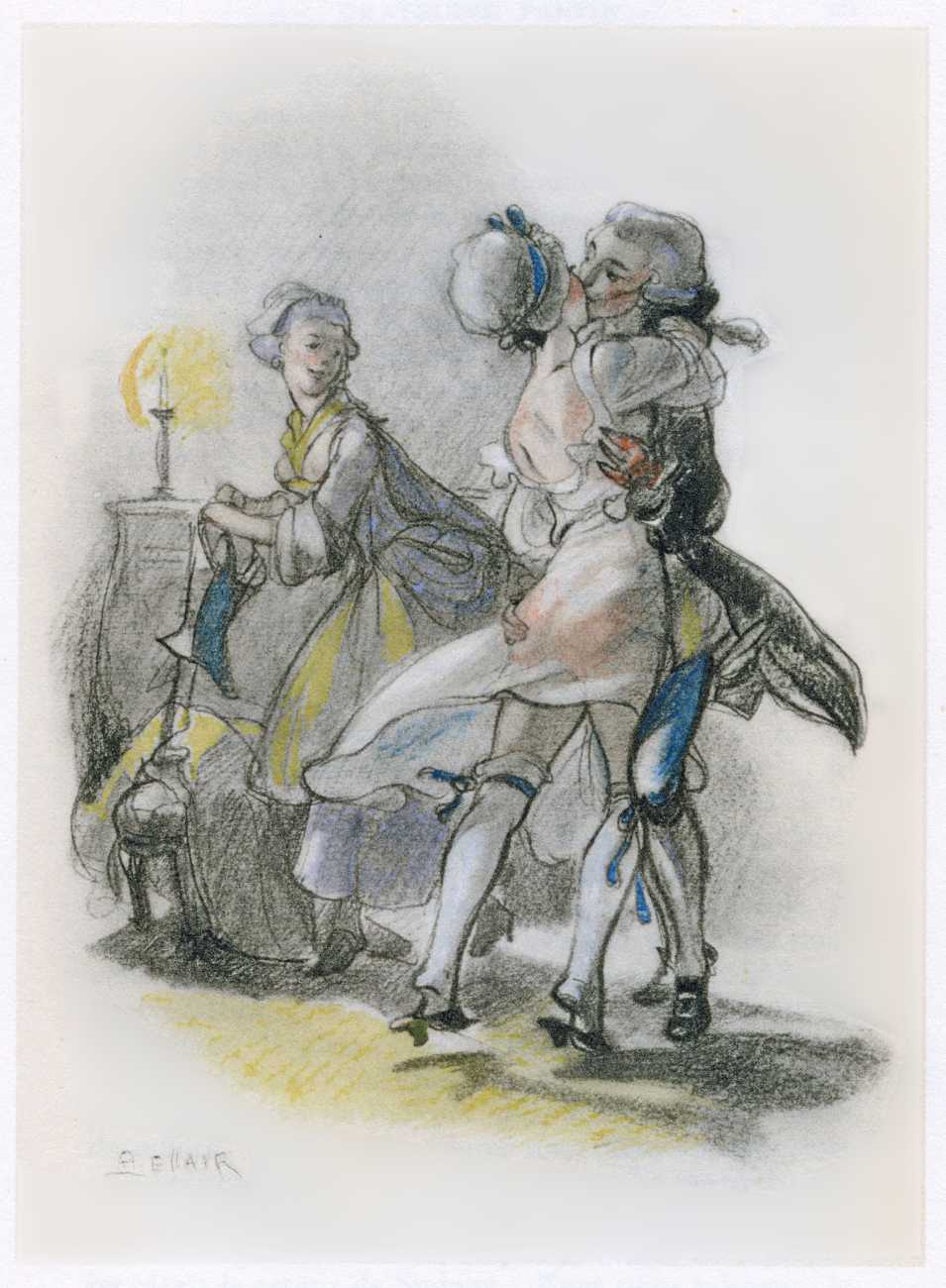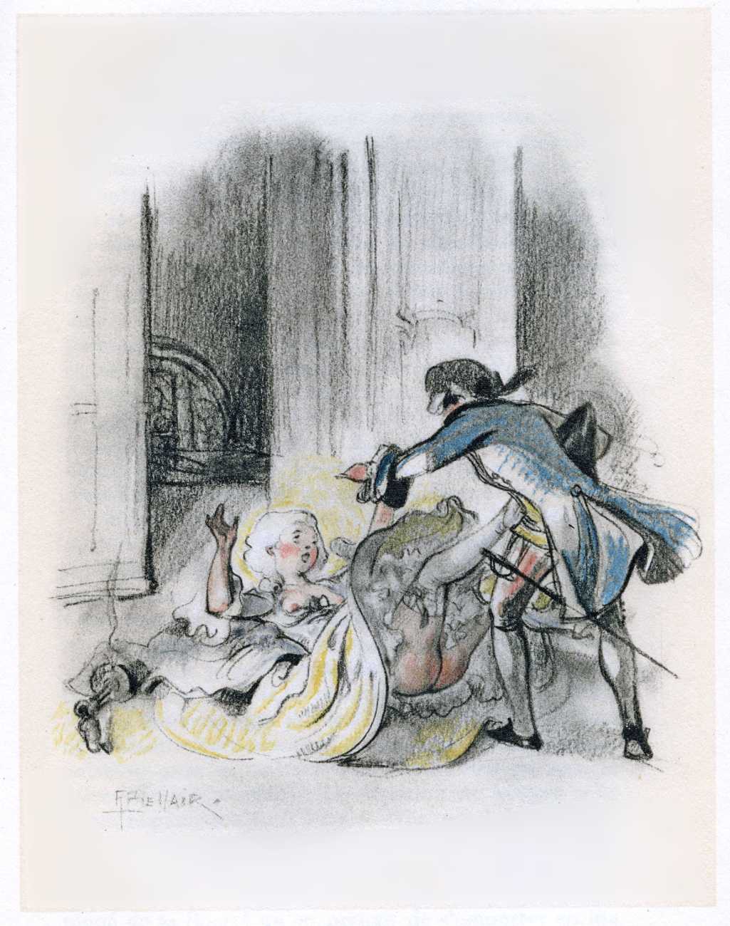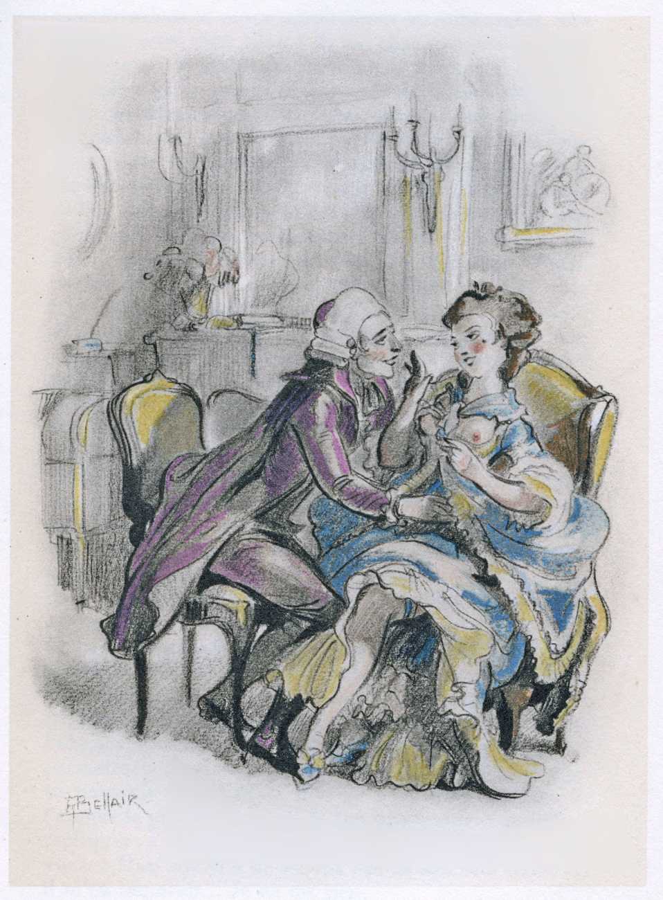 Bellair also illustrated some ten books, the earliest commission being in 1926 for fourteen plates to accompany an edition of the seventeenth-century satirical poetry collection Voyage de Chapelle et de Bachaumont, written by by the two eponymous poets during a trip through Provence and Languedoc. The first of several erotic classics for which she produced drawings was Hugues Rebell’s Les nuits chaudes du Cap Français, and it would appear that her skill and reliability in the genre attracted the attention of other Paris publishers, resulting in commissions for Andréa de Nerciat’s Félicia, Pierre Louÿs’ Roi Pausole, and Théophile Gautier’s Fortunio.