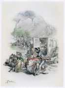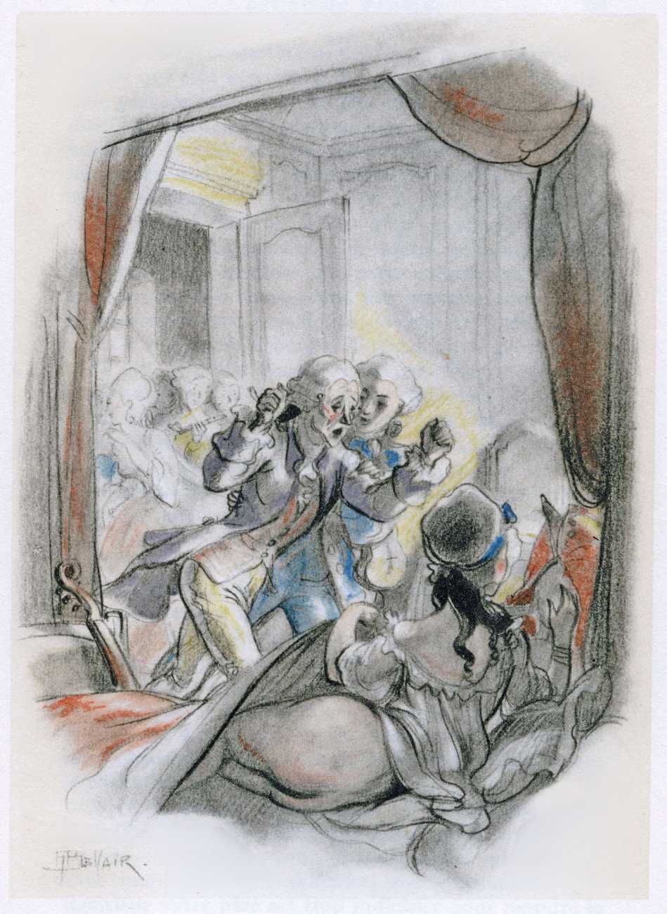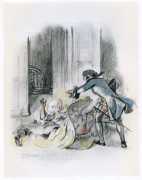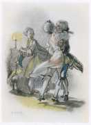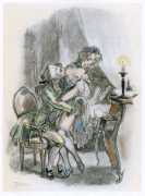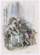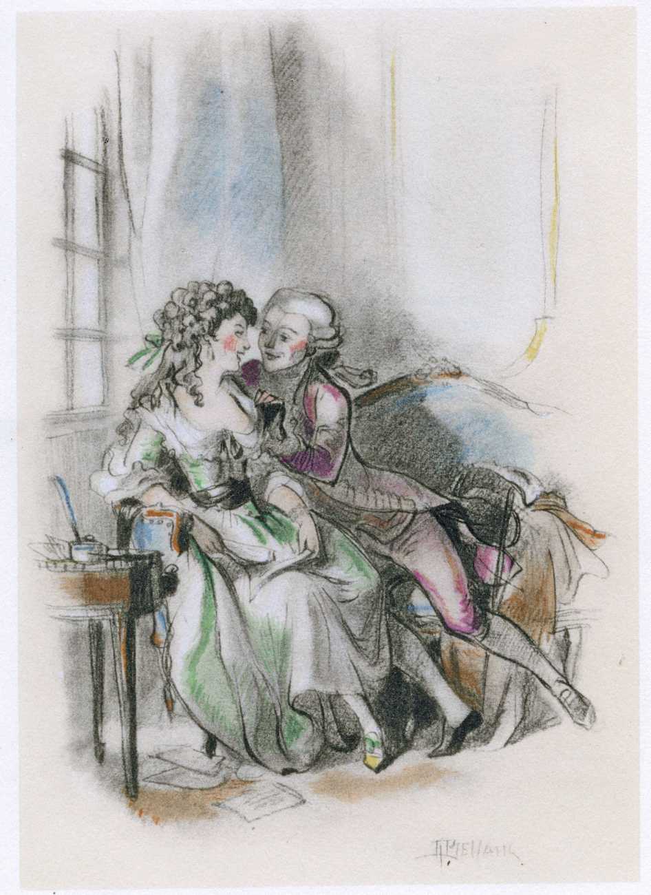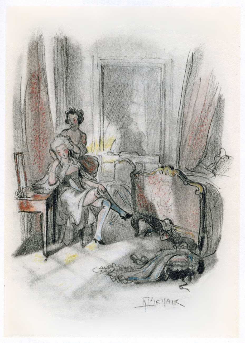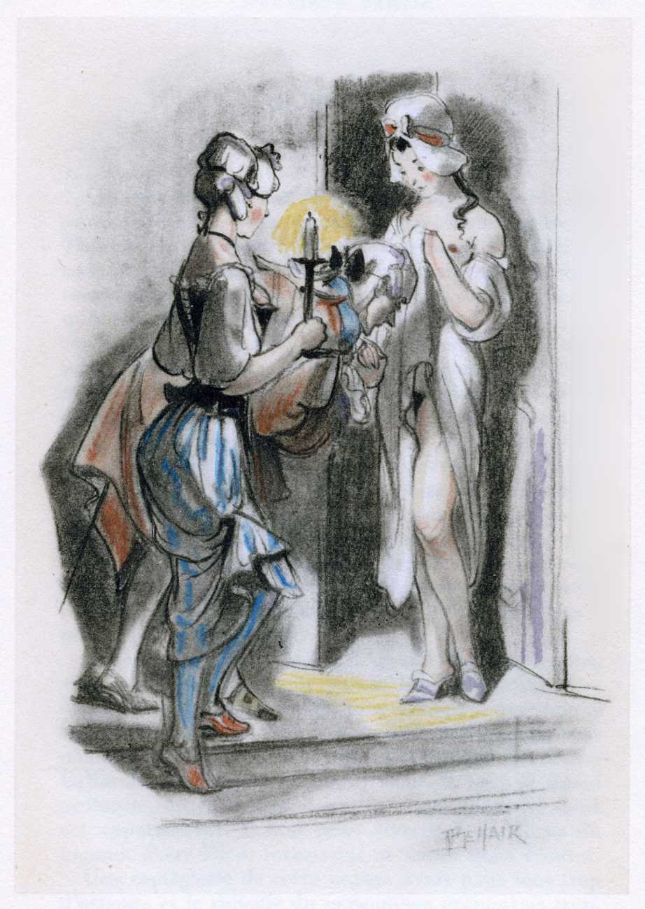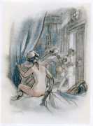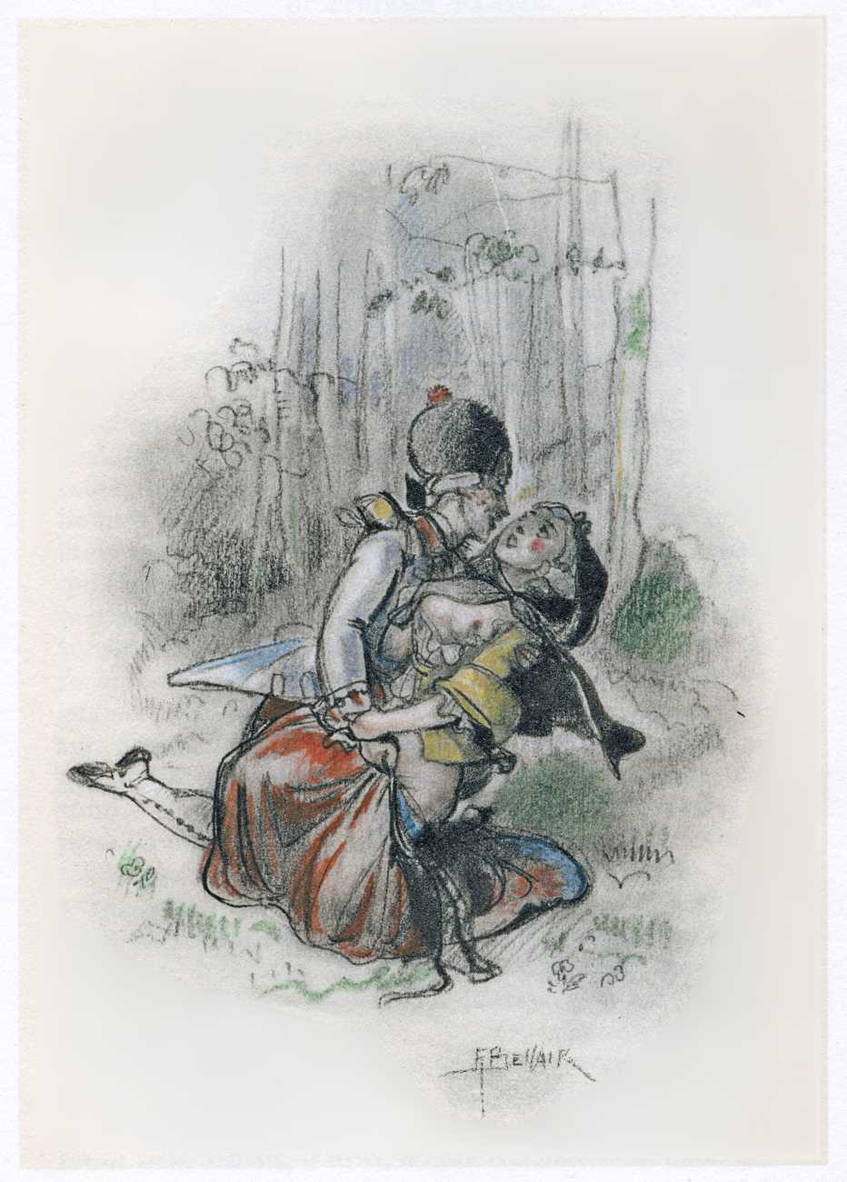 Bellair also illustrated some ten books, the earliest commission being in 1926 for fourteen plates to accompany an edition of the seventeenth-century satirical poetry collection Voyage de Chapelle et de Bachaumont, written by by the two eponymous poets during a trip through Provence and Languedoc. The first of several erotic classics for which she produced drawings was Hugues Rebell’s Les nuits chaudes du Cap Français, and it would appear that her skill and reliability in the genre attracted the attention of other Paris publishers, resulting in commissions for Andréa de Nerciat’s Félicia, Pierre Louÿs’ Roi Pausole, and Théophile Gautier’s Fortunio.