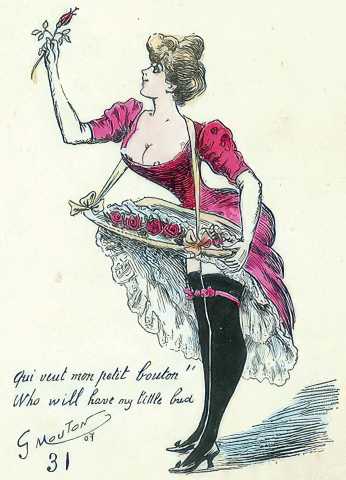 During the early years of the twentieth century many risqué erotic prints were sold in sets in small Parisian bookshops, often ‘sous le manteau’ or ‘under the shelf’. Most of these examples bear Mouton’s signature, some printed examples also having his trademark sheep motif, ‘mouton’ being the French word for sheep. Some have handwritten titles, and tellingly some also have (bad) English translations, suggesting that their clientele was sometimes English gentlemen taking the opportunity to acquire such rarities, unavailable at home, while visiting Gay Paree.