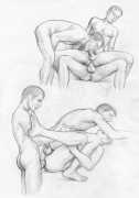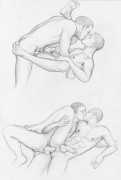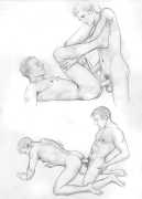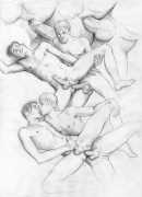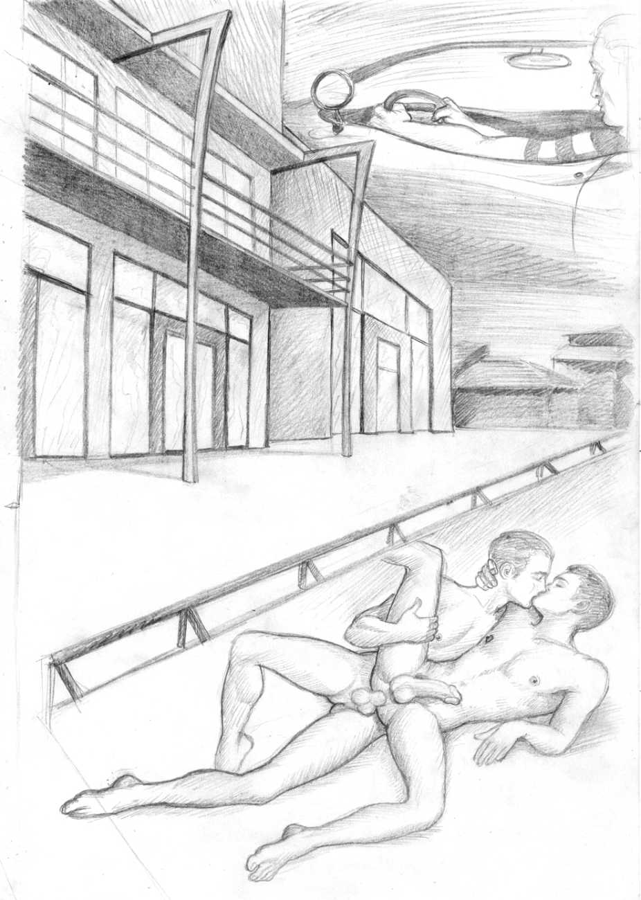 These are the drawings from Marco Zagato’s early unfinished comic book project, in which two young friends are made to compete against each other in a sort of arena, like futuristic gladiators. Zagato imagined that the two protagonists were more than friends, but in reality secretly engaged. From these early studies of the aesthetics of gay eroticism, the artist’s later work on the same theme was later to be born.