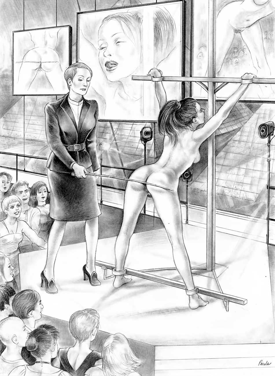 It’s with great pleasure that the Erotic Print Society publishes another anthology of Lynn Paula Russell’s graphic work. This group of drawings is an essential addition to the books, dedicated to her art, that are already in print as it completes, more or less, a record of all the commissioned work she drew for Februs magazine. Februs is a magazine dedicated to corporal punishment, and has benefited over the years from Paula’s editorship and artwork.