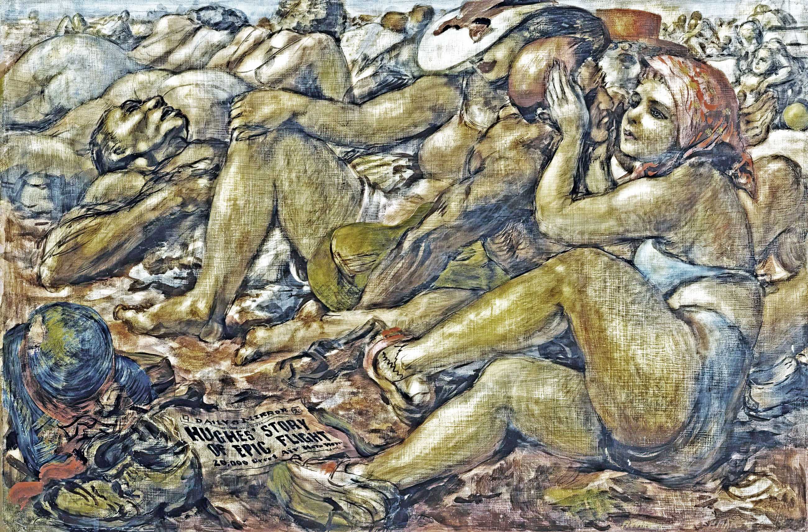 Marsh loved to venture to the popular New York beach resort of Coney Island to draw and paint, especially in the summer. There he began to create works depicting massed beached bodies, emphasising the bold muscles and build of his characters, emulating the heroic scale of the older European paintings. As he explained, ‘I like to go to Coney Island because of the sea, the open air, and the crowds – crowds of people in all directions, in all positions, with and without clothing, moving, like the great compositions of Michelangelo and Rubens.’