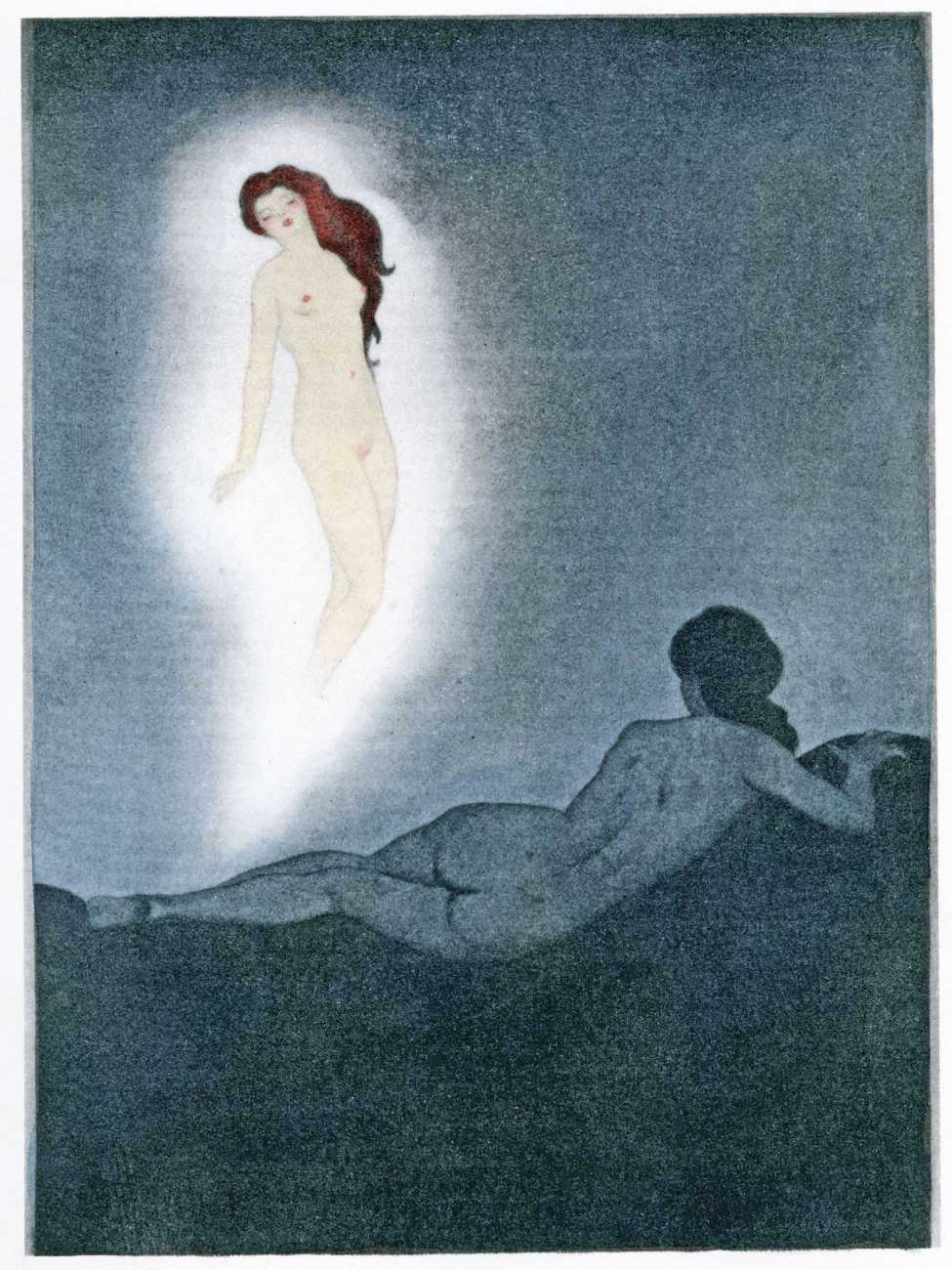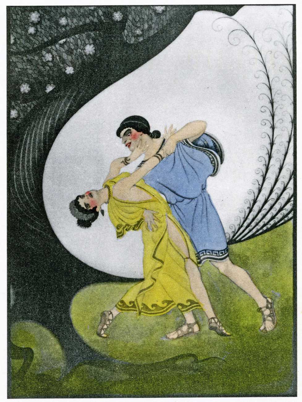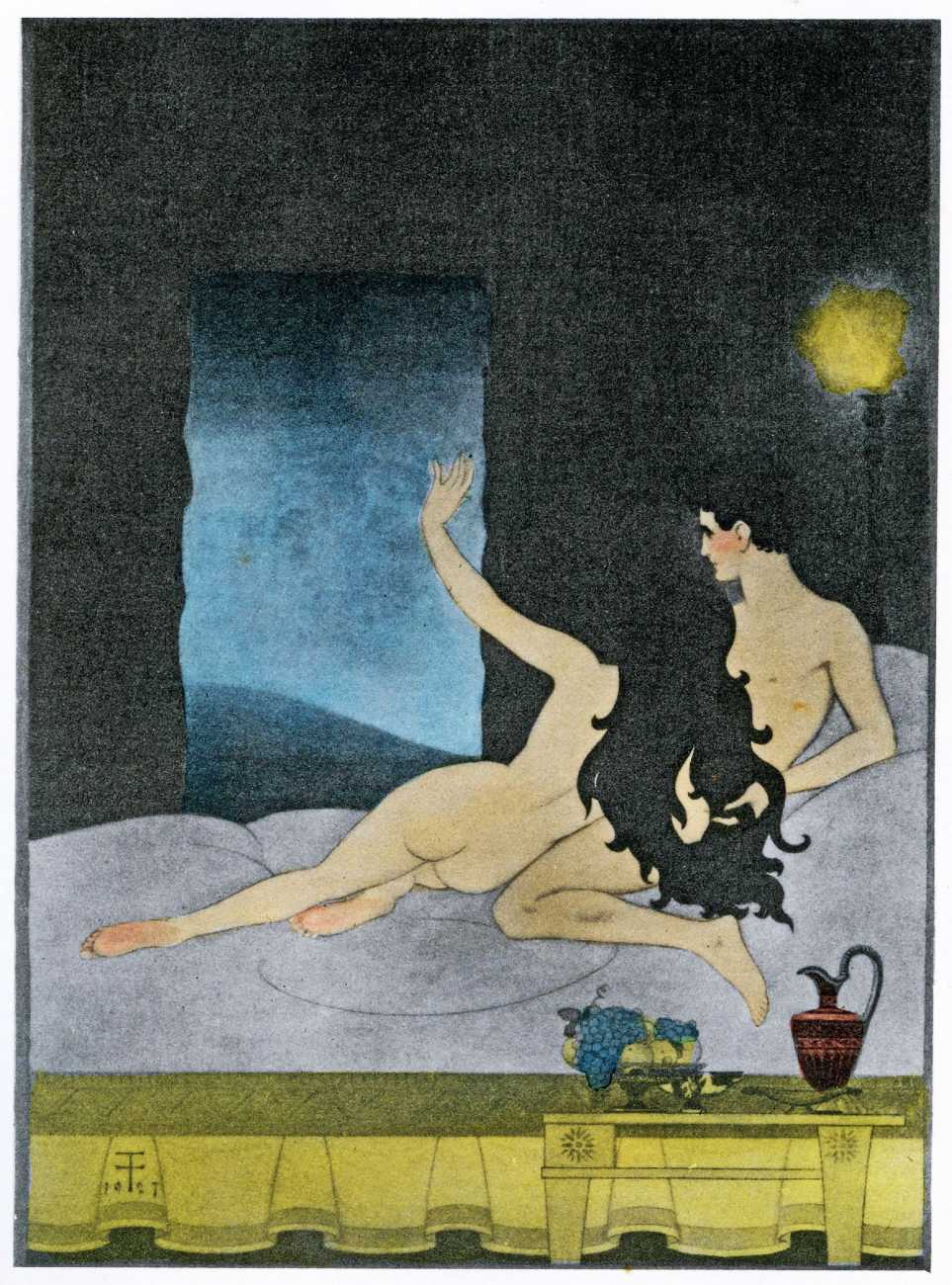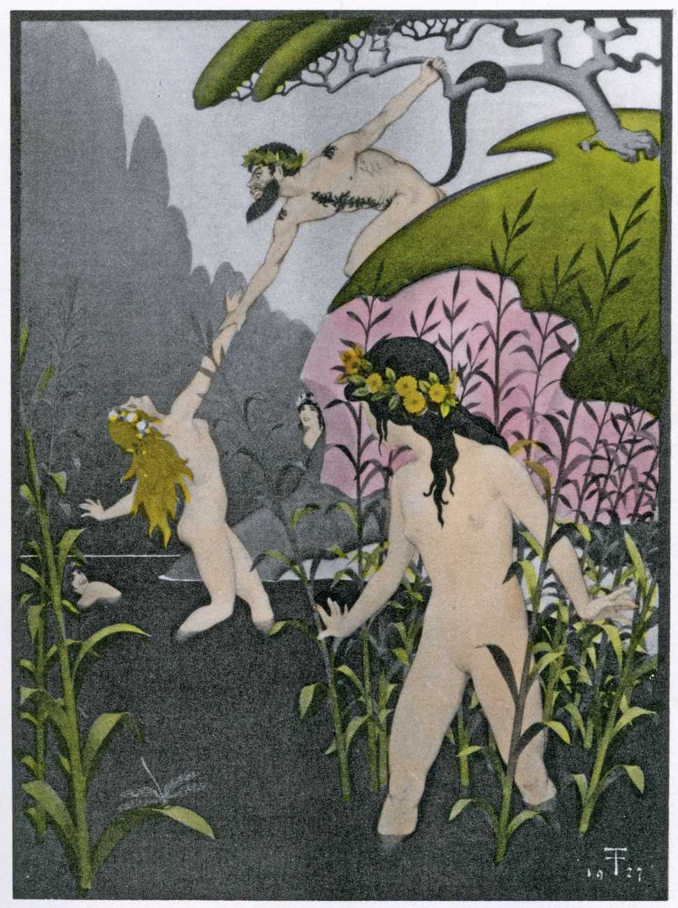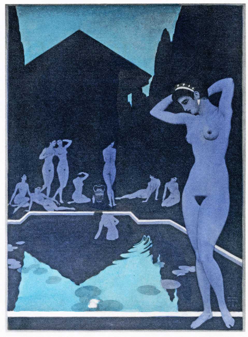 This luxury edition of The Songs of Bilitis was commissioned by The Pierre Louÿs Society, a small US private press and subscription society that issued limited-edition English printings of Pierre Louÿs’ works in the mid- to late-1920s. It clearly recognised the appropriateness of commissioning an artist schooled in the European tradition and now living in New York, and though the quality of the printing does not do full justice to the subtle colouring of Franz Felix’s paintings, especially in the darker tones, the originality and modernity of the plates is still striking. The Songs of Bilitis was produced in a limited edition of 933 copies. The translator was Mitchell Starrett Buck (1887–1959), who also translated several other Pierre Louÿs works for American publishers.