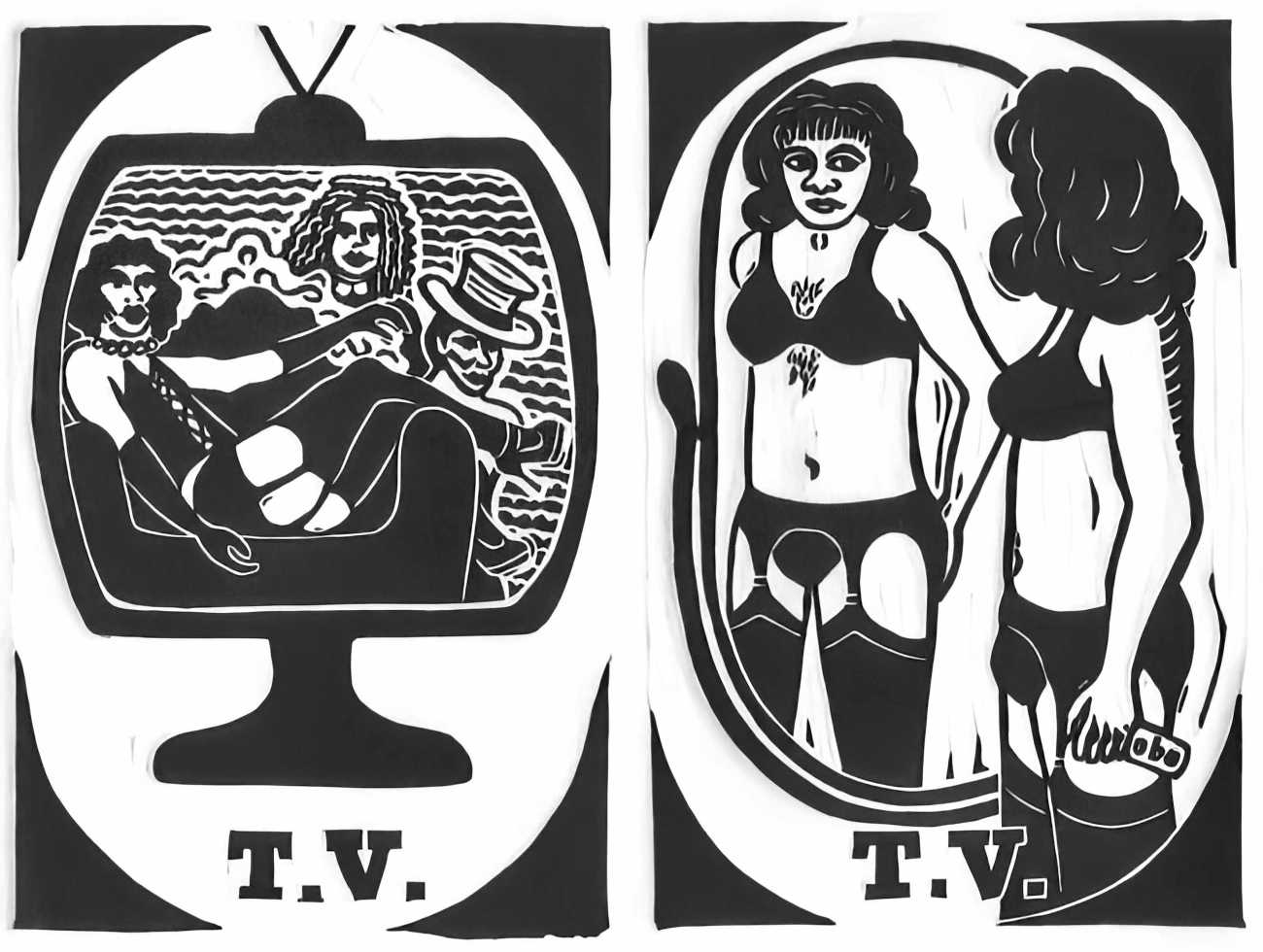 These prints poke fun at our various identities, play with stereotypes, allude to tensions between the many communities gathered under the umbrella ‘queer’, and reference our historical and continued oppression as sexual and/or gender minorities. Only once did I receive a complaint about the barbed humour in the prints. I heard, second-hand, that a viewer was offended by my placement of the ‘bi’ trio sitting on a fence. In her view the print evoked the notion that bisexuality is an identity for folks who haven’t yet decided who they really are, implying that bisexuality isn’t a valid choice in and of itself. Indeed, the print does just that – though I hoped that the accompanying image of the trio merrily driving off in a car with an ‘Anything That Moves’ bumper sticker would convey their flippant dismissal of those beliefs, their fence-sitting as a sassy act of empowered choice.