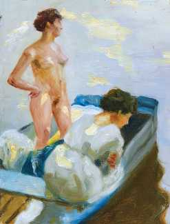 Leo Putz explored eroticism through his oil paintings of naked women, producing works that balance art nouveau elegance with an impressionist sensibility. Rather than shocking revelation, his erotic paintings tend toward a cultivated sensuality, with languid poses, softly modelled flesh, and a focus on atmosphere – sunlit skin, reflective water, and the enclosing landscape – which makes sexuality part of a larger, pictorial harmony.
